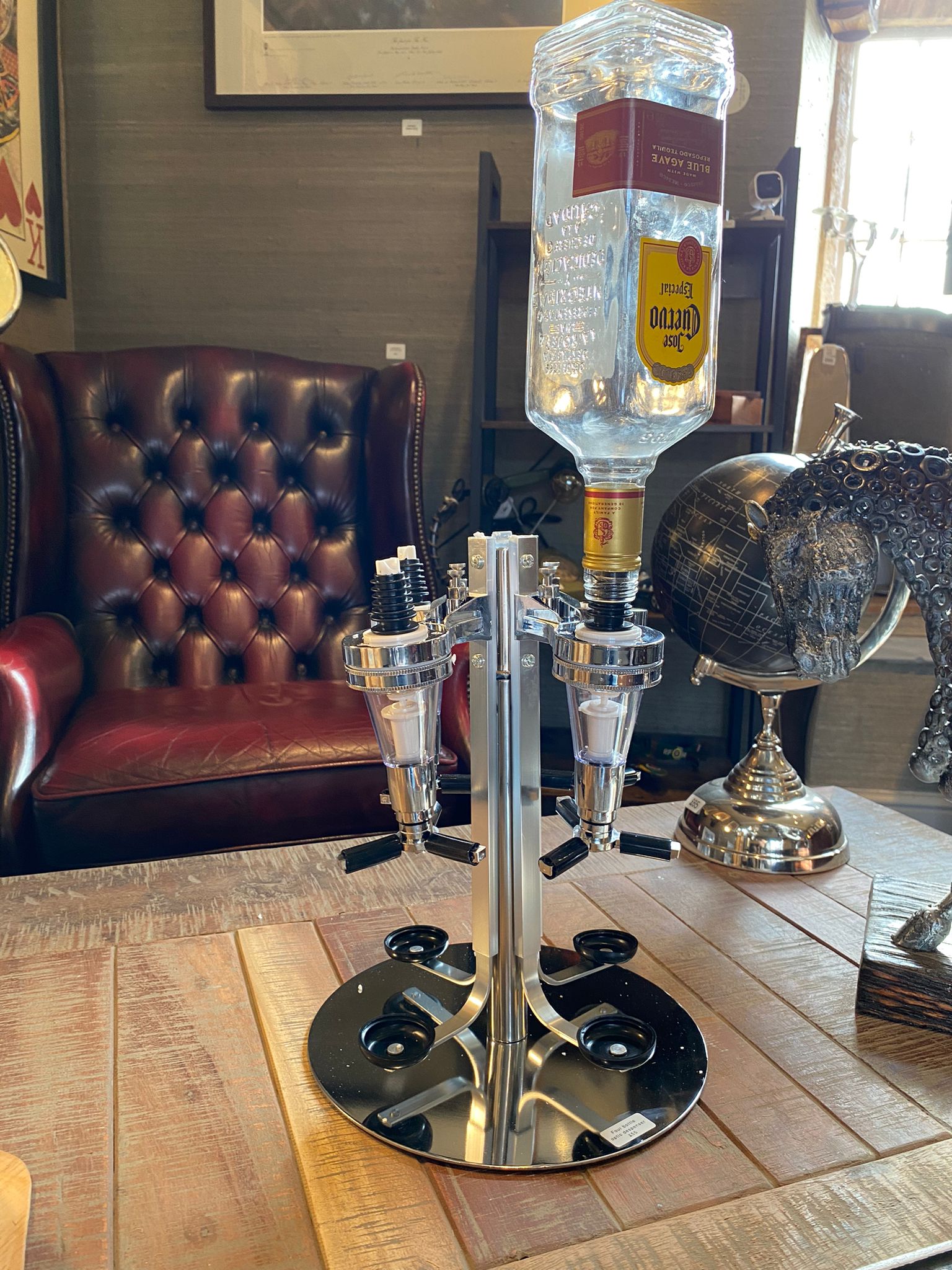 Free-standing drinks dispenser with four leak-proof optics. Spring loaded receptacles holds bottles of various sizes up to 1 litre.