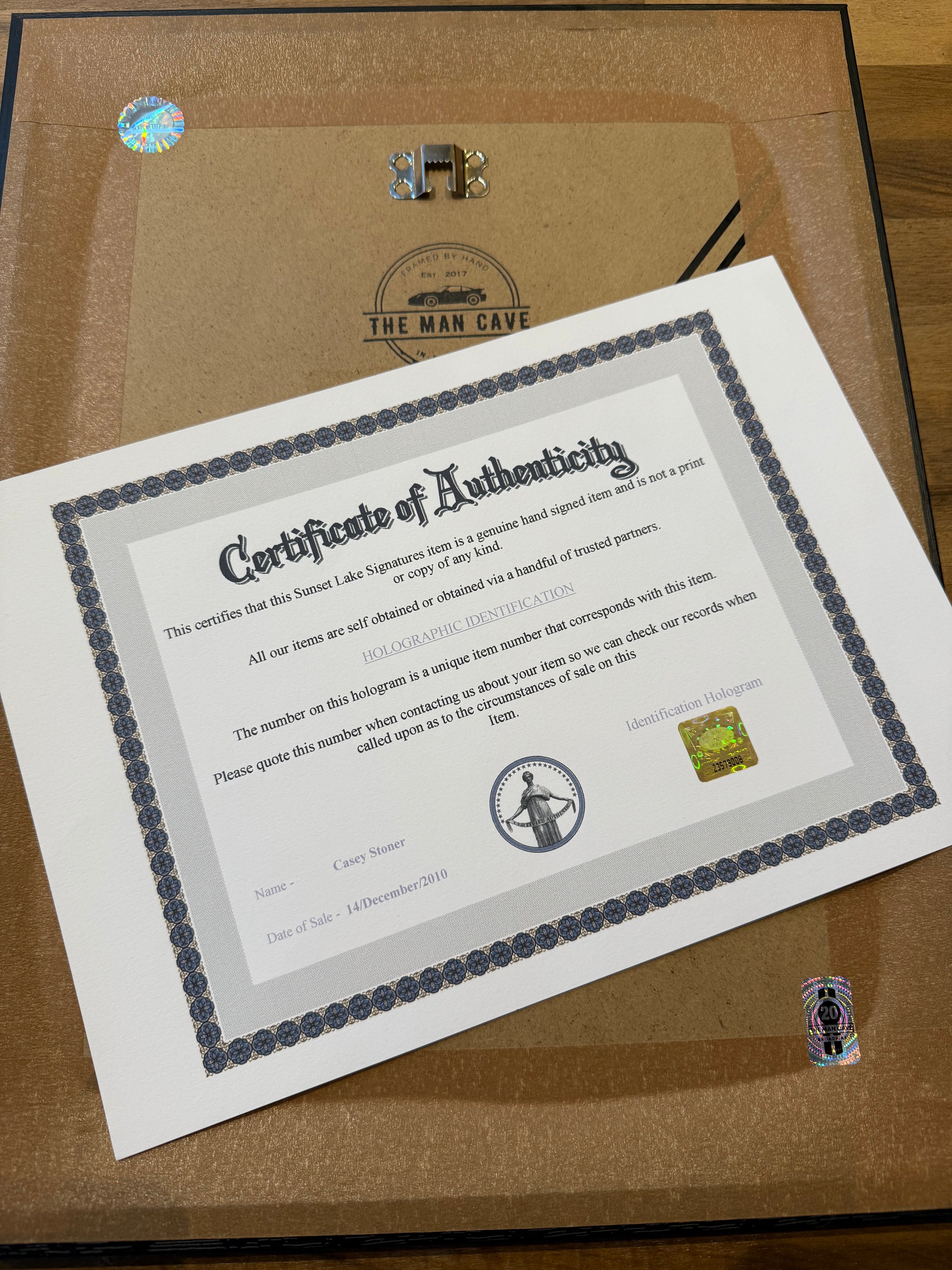 This genuine Casey Stoner Signed Framed Photograph features a genuine autograph and includes a certificate of authenticity for validation. The photograph is sized A4, and elegantly displayed in an oversized frame with a mount, making it a distinguished addition to any collection, ideal for motorsport enthusiasts and collectors alike.