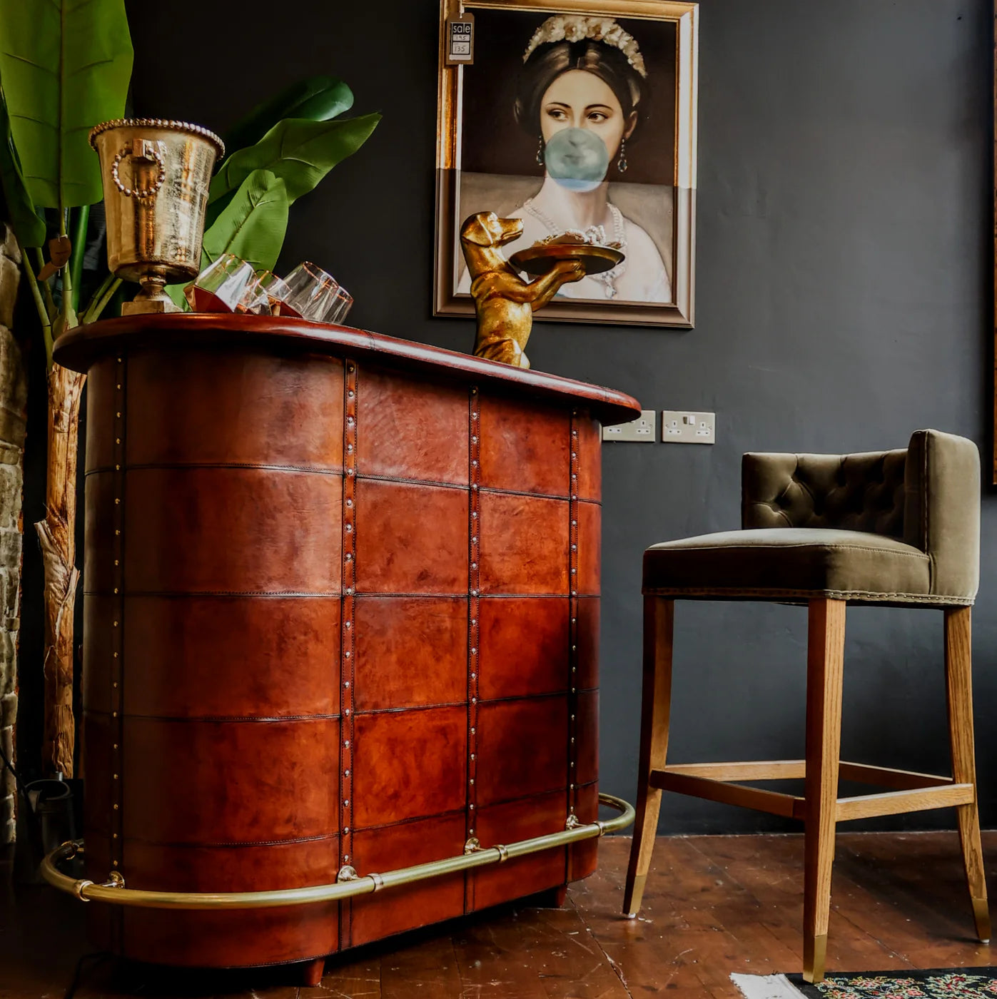 Featuring a beautiful leather Counter Top and Brass Bottom Railing. This Bar is Hand Crafted in Cognac Leather - Is truly Stunning - Comes with Storage at the rear for all your bottles an beers its an absolute feature piece!