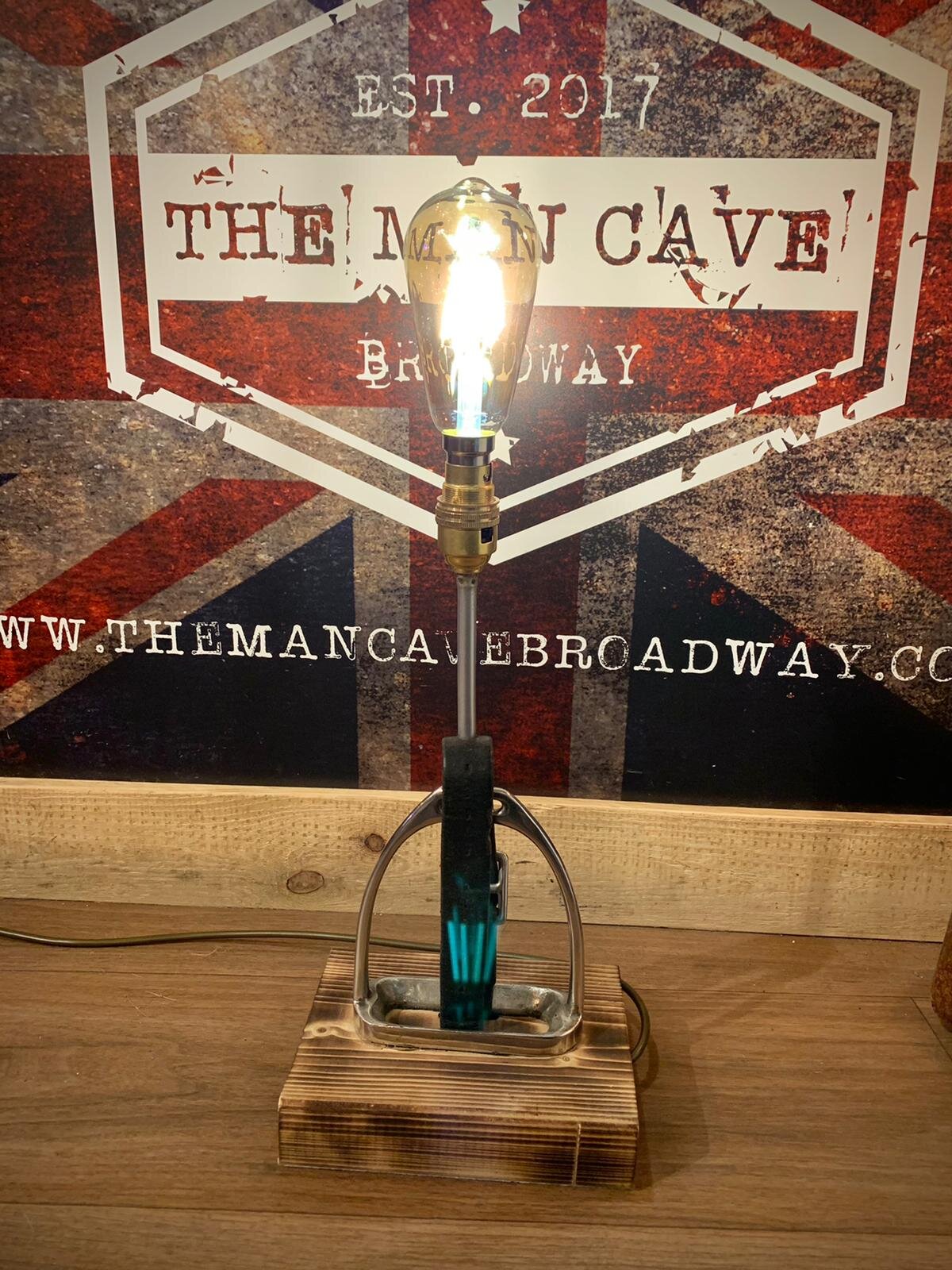 This beautiful lamp has been created using a stirrup fixed to a hand crafted wooden base and has been professionally wired up and Pat tested. It also comes with an Edison style bulb too… so you can enjoy it straight away!