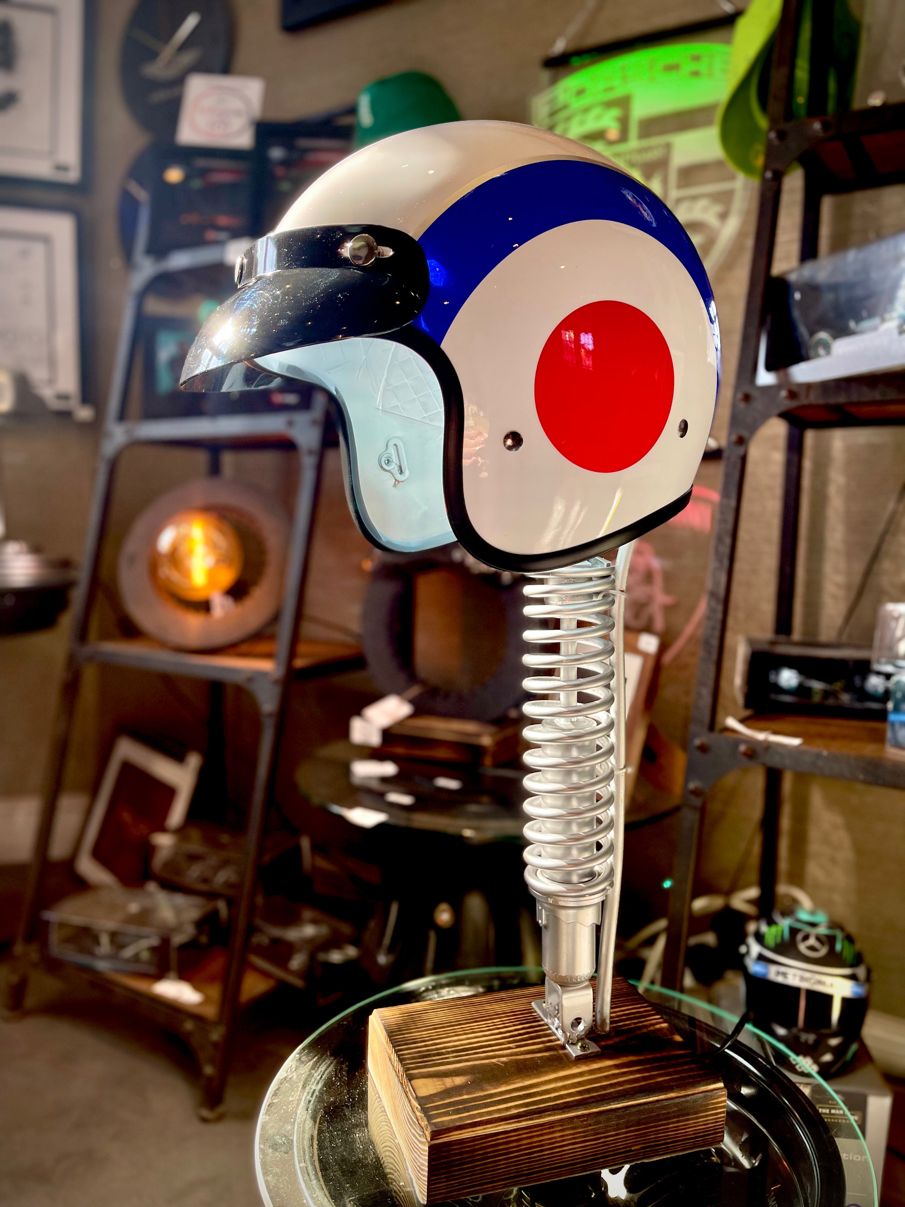 Yep… these are cool as! Crafted using brand new Union Jack, MOD or USA style helmets and a motorcycle damper fitted to a bespoke wooden base. Professionally wired up and PAT tested ready to display.