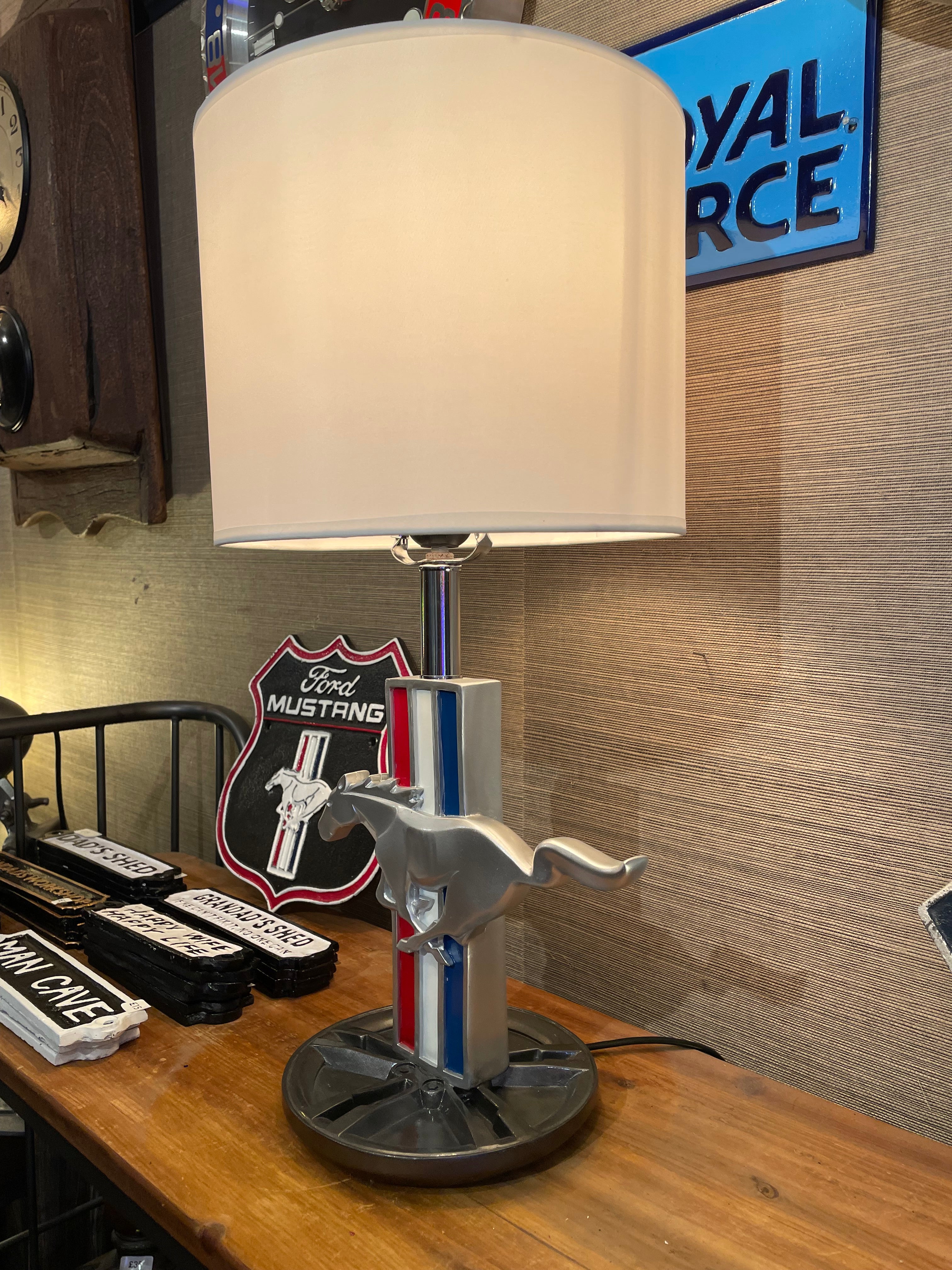 Depicting the Mustang Horse Tri Bar logo, sitting on top of a car wheel. Made from resin with a lovely painted finish, complete with a cream light shade, an in line switch and a UK 3 pin plug.