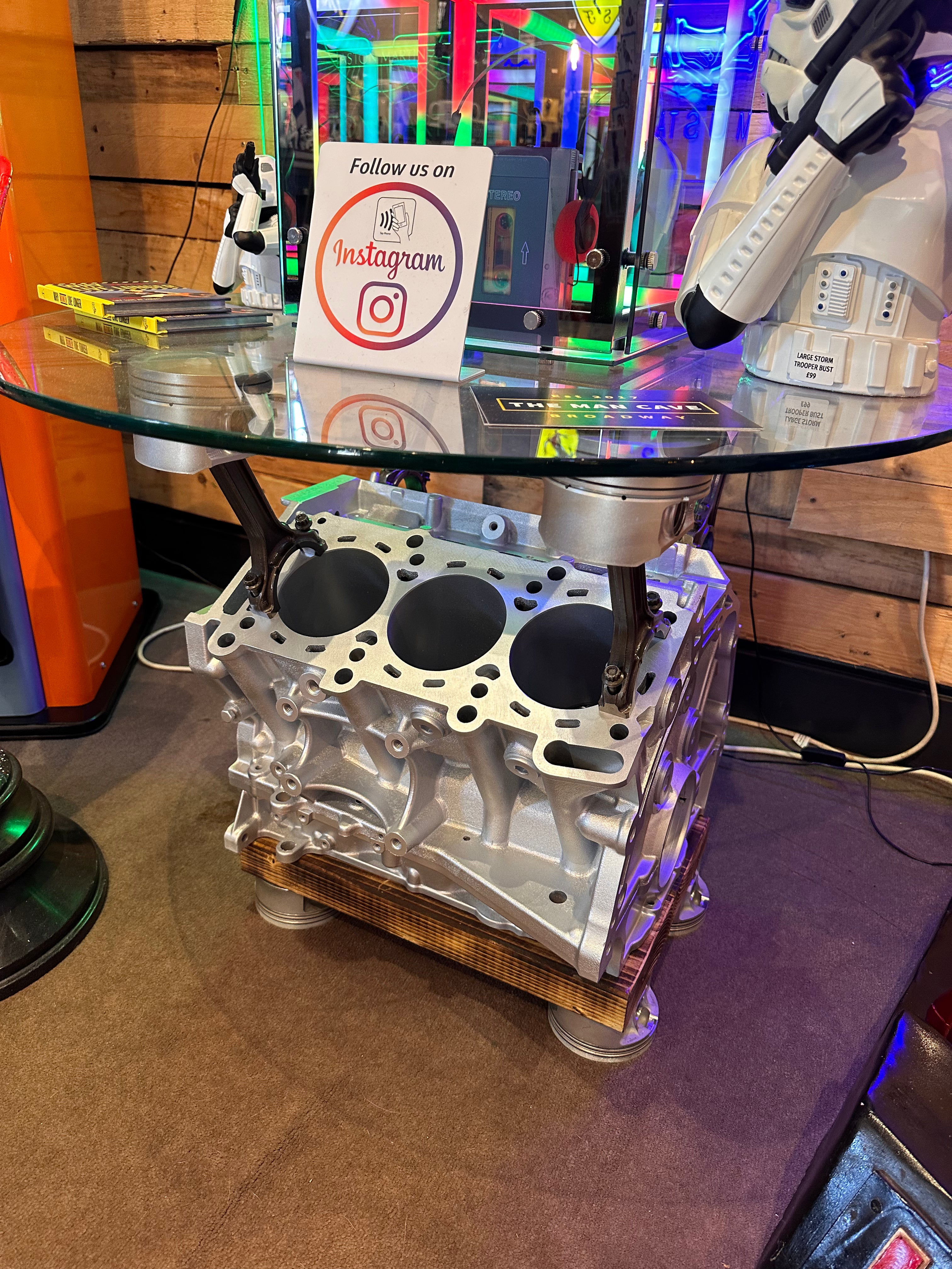 Created from genuine LITCHFIELD RACING GTR parts… choose from our engine block table where we’ve used GTR pistons and con rods to support the glass (glass included), or even our bespoke crankshaft stools (which are awesome!), with hand turned oak bases and 40cm diameter padded seats.