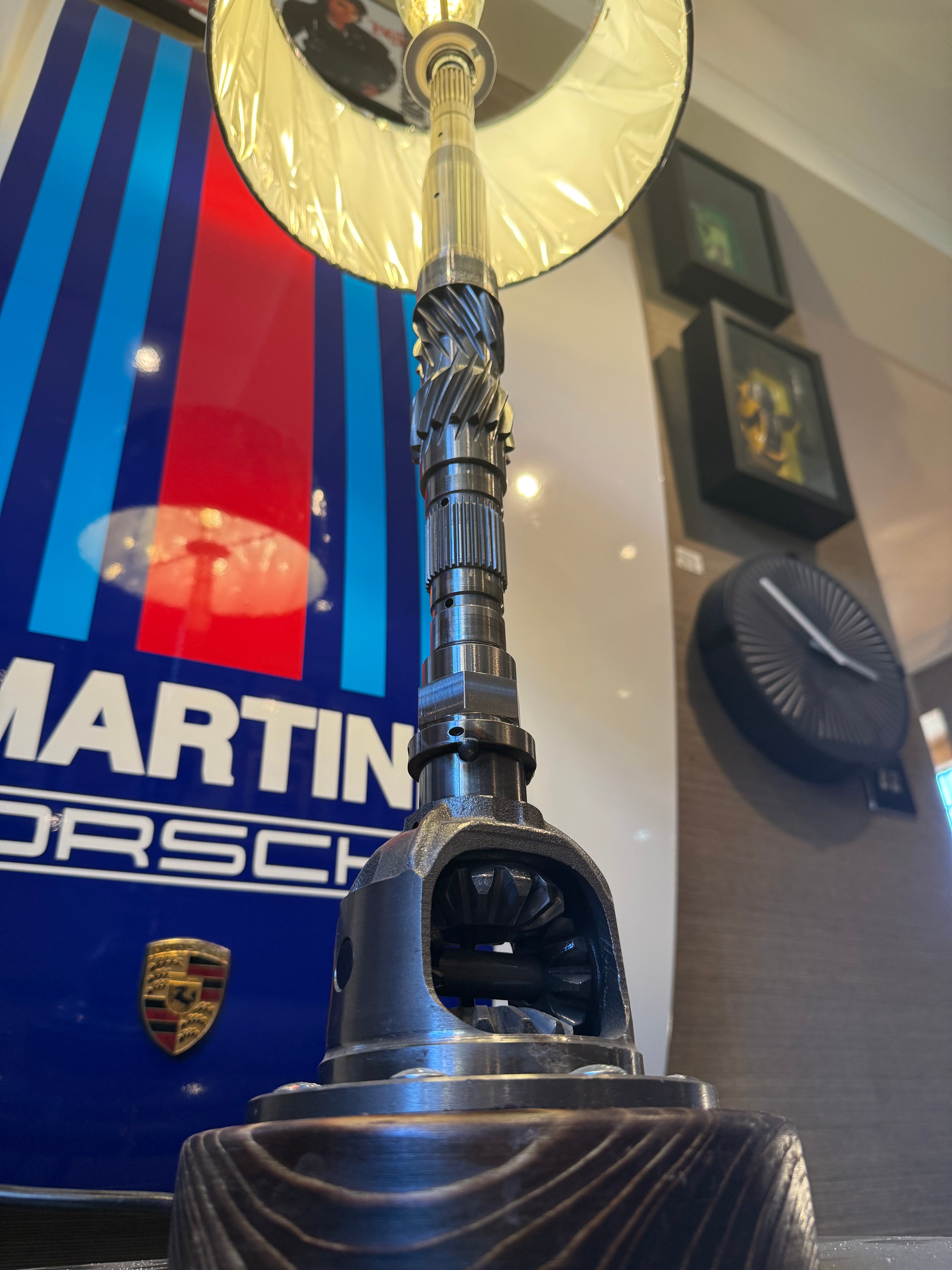 How incredibly cool is this! Created using genuine Litchfield Motors Racing Nissan GTR parts including a layshaft and differential mounted onto a bespoke wooden base, with a lovely brand new lampshade and Edison style bulb.