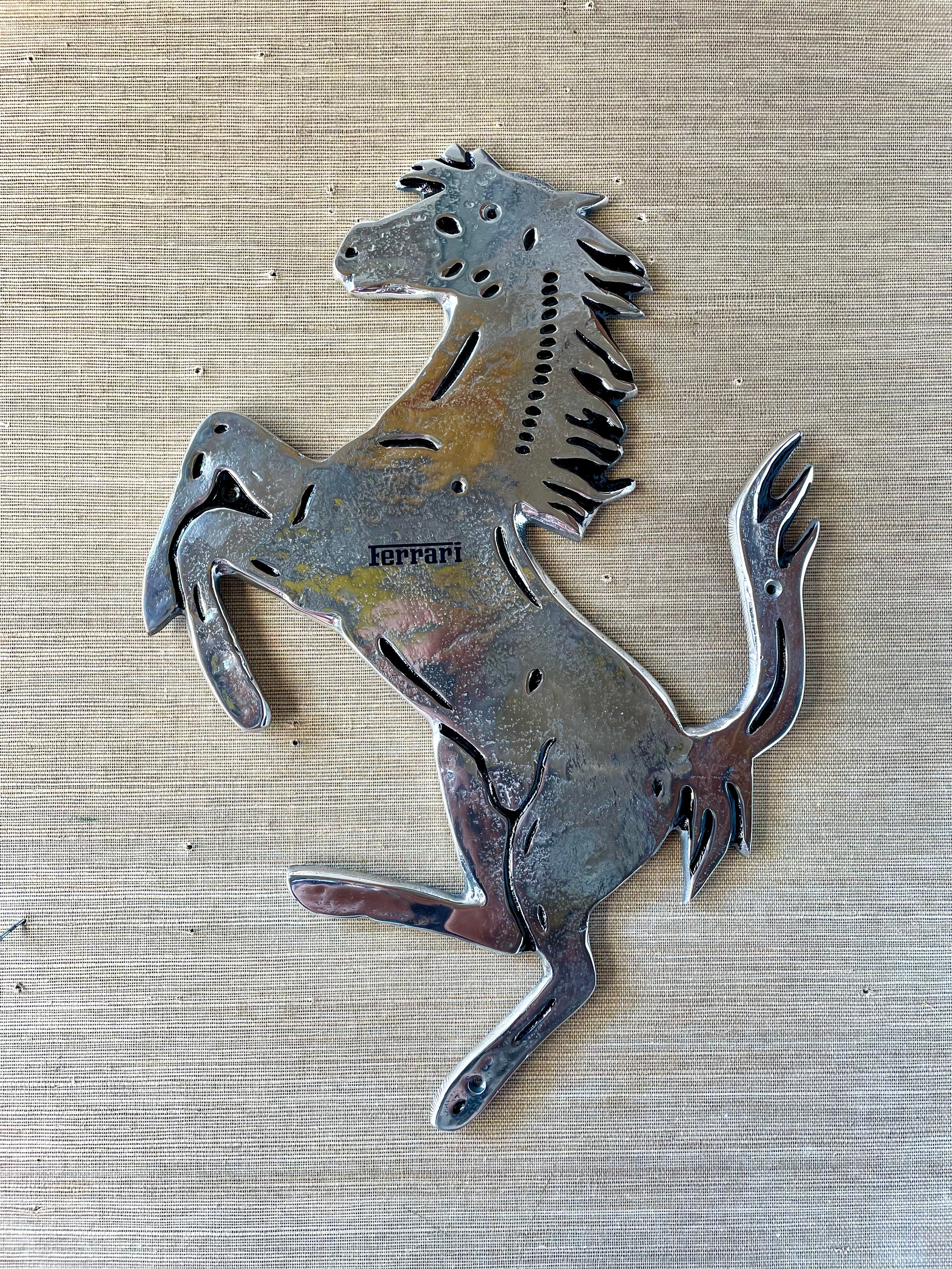 This polished aluminium retro horse style wall plaque features a prancing horse design, evoking the elegance and power of the iconic brand.
