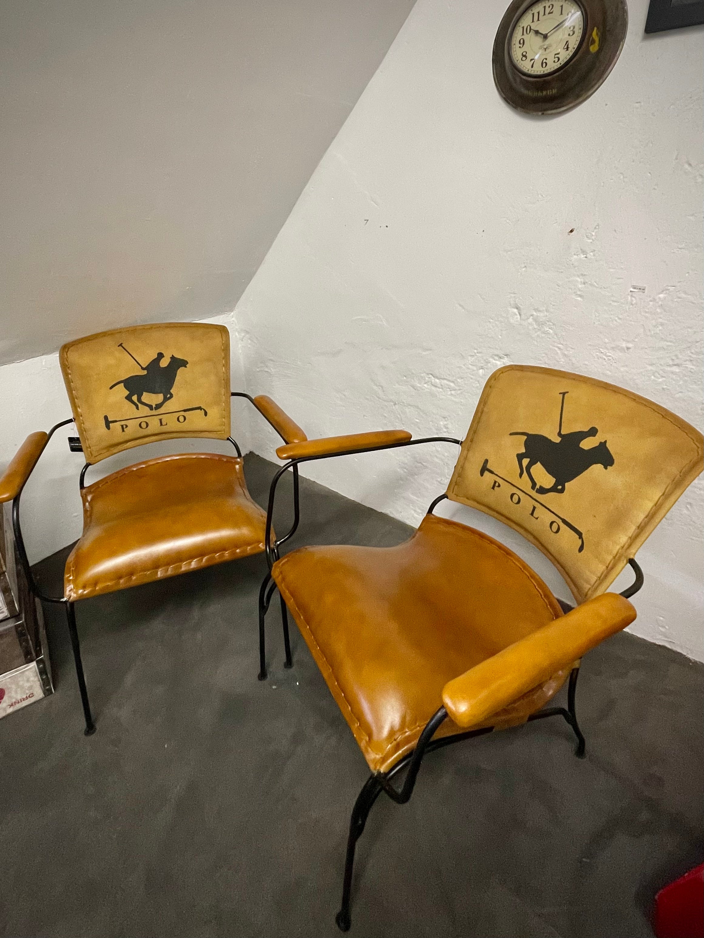 Upcycled Metal Frame Chair with Padded Brown Seat & Armrest with a Polo & Horse logo on the back, Made to be given a worn weathered old look.