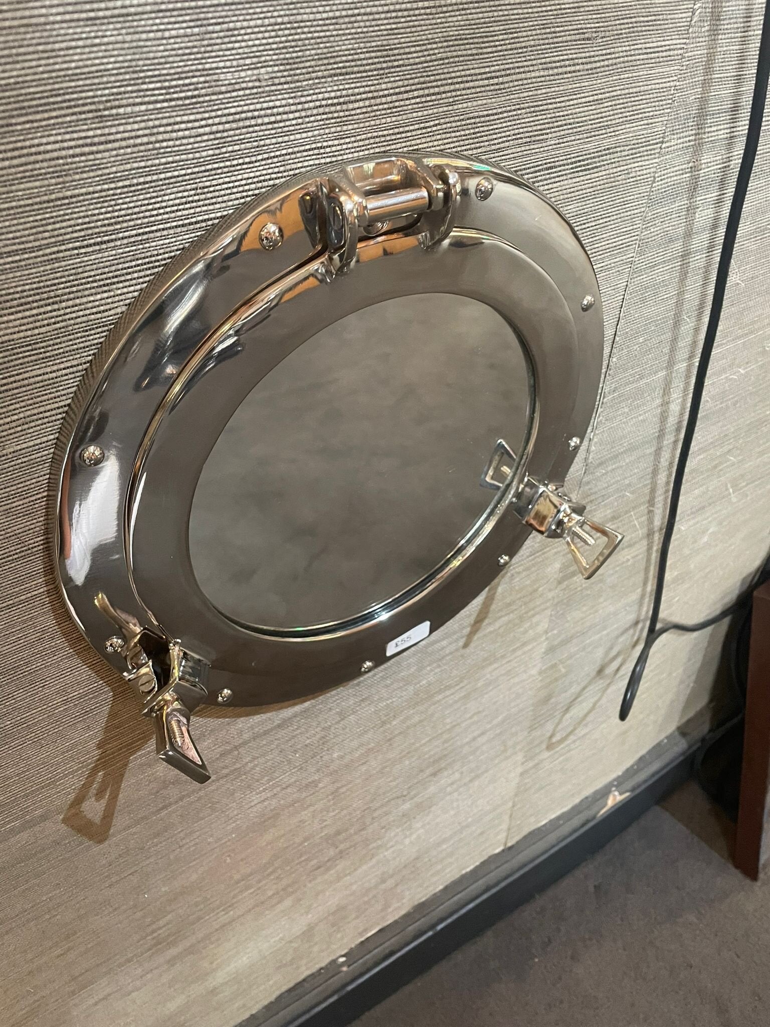 Polished Aluminium porthole style mirror… this really does open up too! So why not add a seaside themed photo behind the porthole!?!