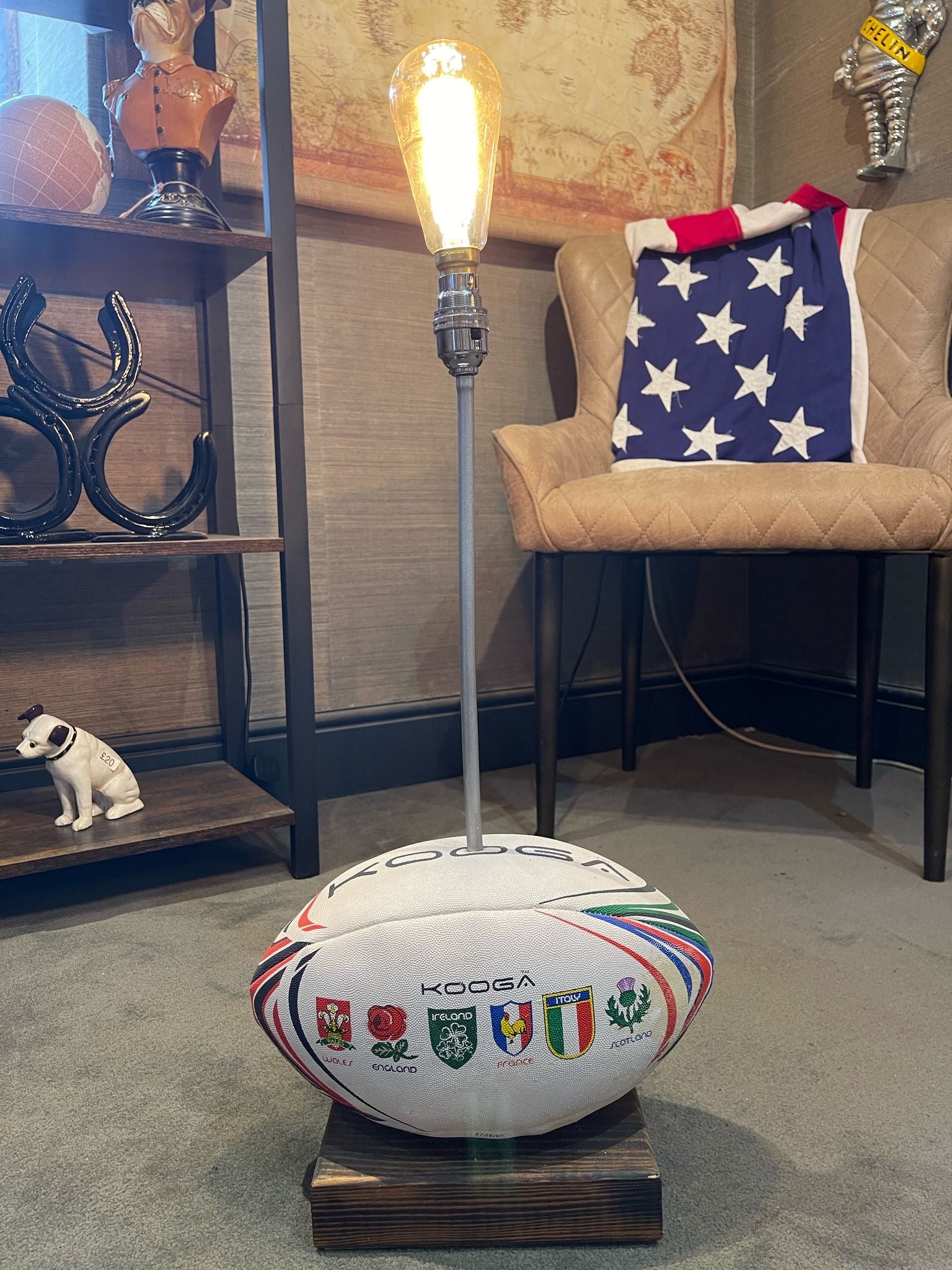 Full size Six Nations rugby ball (size 5) made into an amazing desk lamp! This has been filled with fire retardant foam, fitted to a bespoke hand crafted wooden base, professionally wired up and PAT tested ready to enjoy!